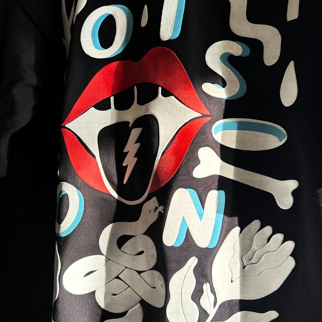 Step into chaos with the Venom Drip tee – a bold explosion of attitude straight from the underworld of streetwear. Featuring toxic puff prints, cigarette-drenched lips, and snake motifs that slither with every step, this is more than a look – it’s a lethal aesthetic.