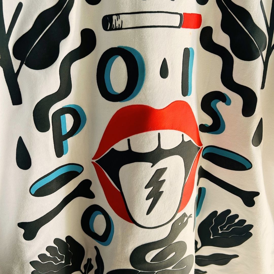 Step into chaos with the Venom Drip tee – a bold explosion of attitude straight from the underworld of streetwear. Featuring toxic puff prints, cigarette-drenched lips, and snake motifs that slither with every step, this is more than a look – it’s a lethal aesthetic.